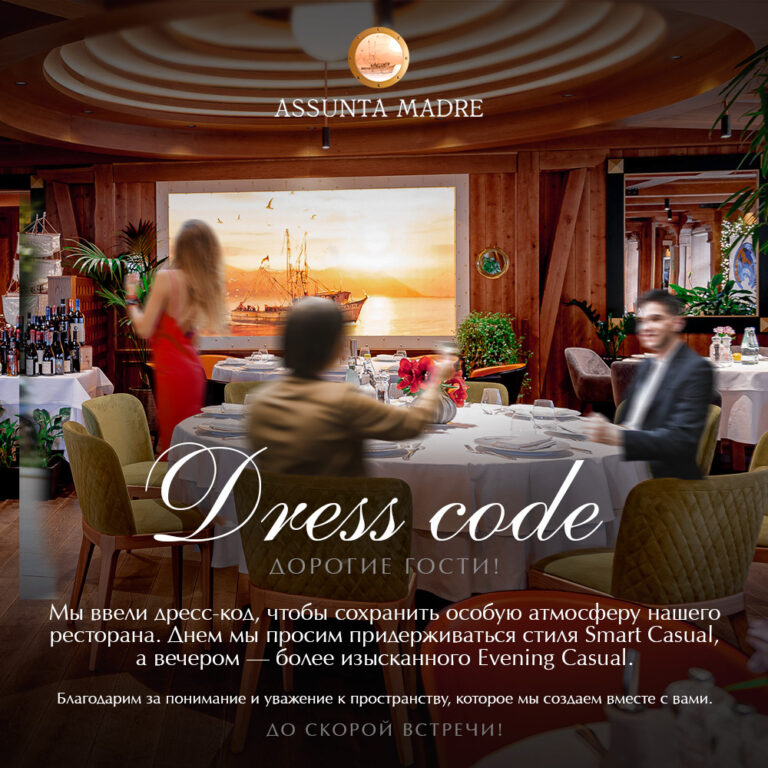 Дорогие гости!Мы ввели дресс-код, чтобы сохранить особую атмосферу нашего ресторана.Днём мы просим придерживаться стиля Smart Casual, а вечером — более изысканного Evening Casual. Благодарим за понимание и уважение к пространству, которое мы создаём вместе с вами.До скорой встречи!