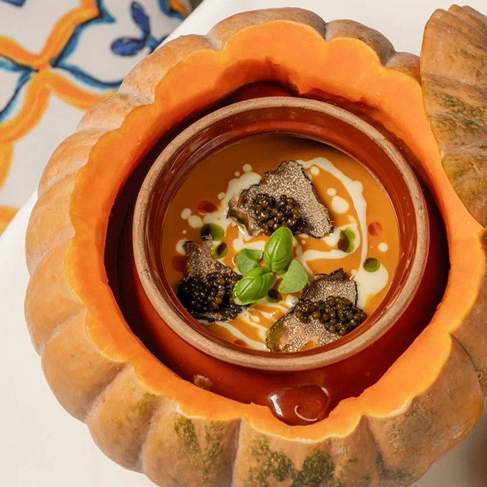 Хрустящая брускетта с белыми грибами и луком — выбор тех, кто желал сменить лисички на белые грибы в этом сезоне. А так же тальолини с белыми грибами с особенным добавлением пармезана, дополняющего спокойную пасту своим характером. Для любителей ярких вкусов — филе утки с соусом Демиглас и тыквенным пюре, а также орекьетте с кальмаром и пармезаном. В дровяной печи приготовят нежную осеннюю пиццу с пюре из тыквы, горгонзолой и трюфелем. О десерте, как всегда, позаботился шеф-кондитер ресторана — Бек Караев. В меню для вас всеми любимый шоколадный фондан со сливочным мороженым.